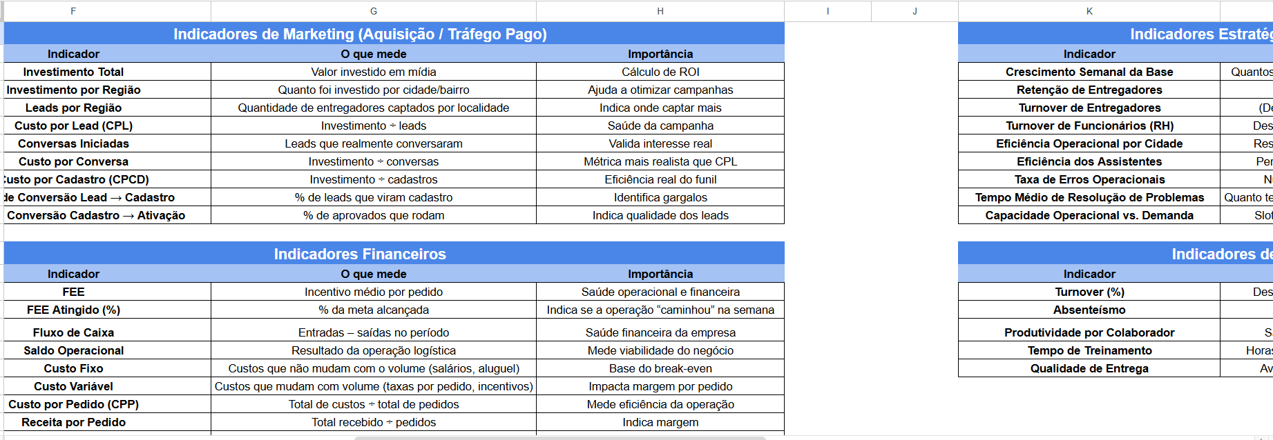 Aqui desenhei todos os indicadores da empresa, sendo de áreas: RH, Gestão Geral, Financeiros, Marketing, Atendimento e operações. Totalizando 56 indicadores.
